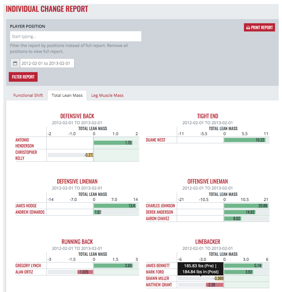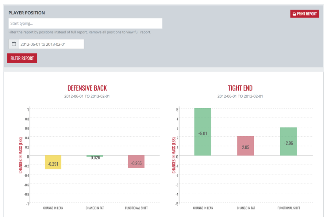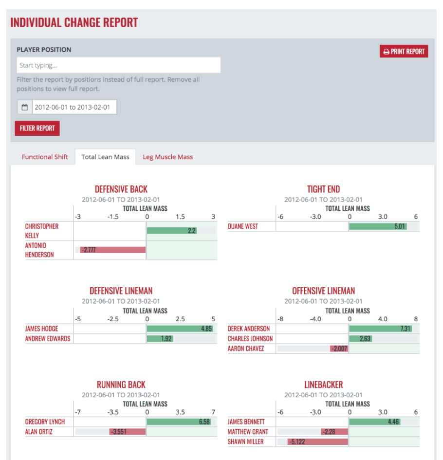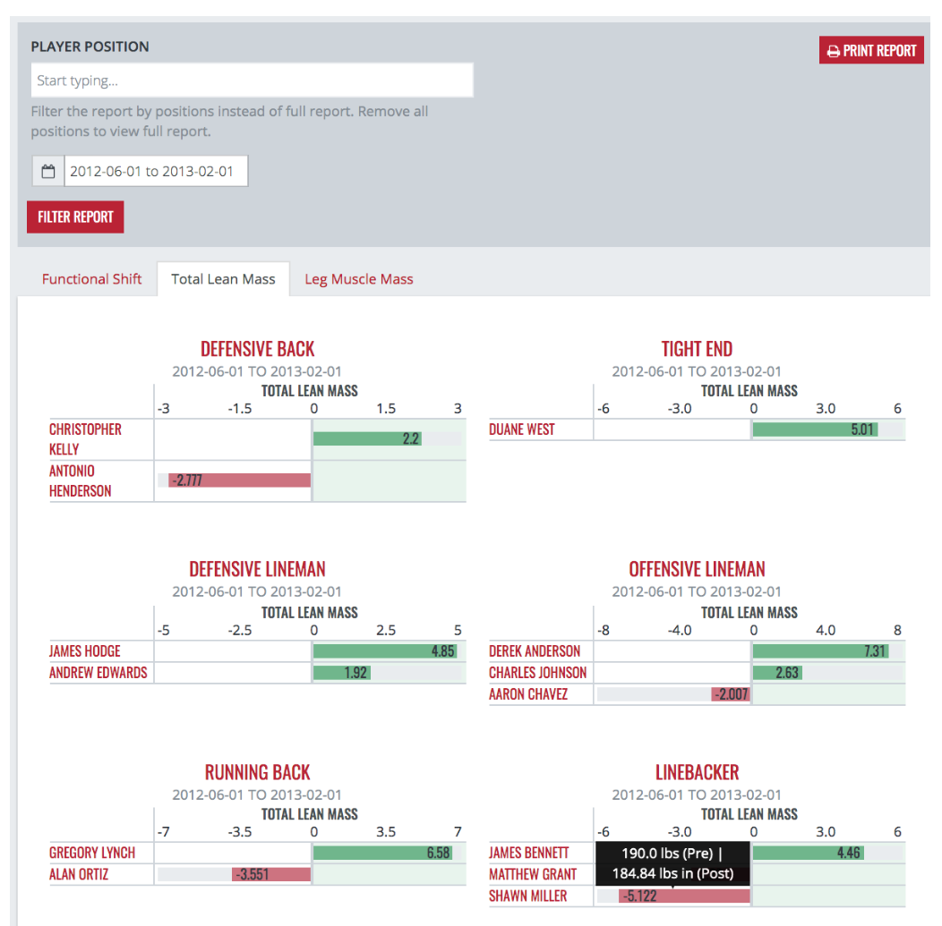 For the following example reports, we used football positions and took the time frame of June 1, 2012 to February 1, 2013. For most teams, this would include the changes that occurred during the competitive season with the June measurements serving as a pre-season scan through January being post-season. Depending on your scanning schedule, you may be able to narrow these dates closer to the start and end of the season.