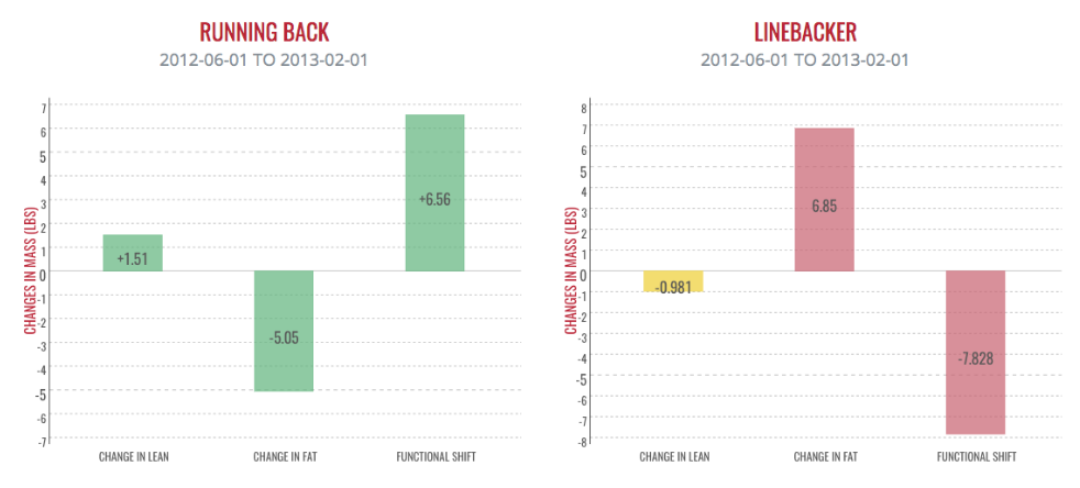 Looking at the reports we can quickly see the variation between different position groups. TE, DL, OL, and RB had, on average, positive changes for both total lean mass and total fat mass causing a positive functional shift. However, DB’s and LB’s had negative shifts, with linebackers, on average, gaining almost 7 pounds of fat mass.