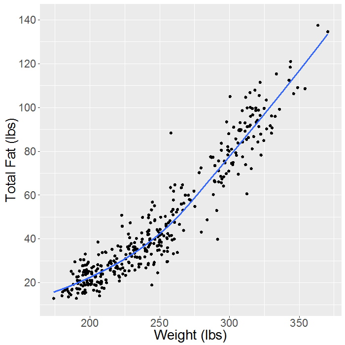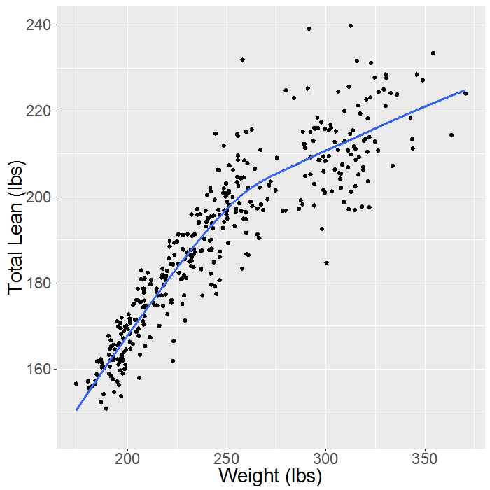 Each athlete, no matter the sport, has a unique body type and composition. Understanding her/his distribution of mass, i.e. where fat and muscle are stored, helps to understand the response to different training and nutrition plans. Changes in weight can cause differing changes in the type and distribution of fat and muscle storage. We have shown previously in male athletes how increasing weight is associated with a higher proportion of fat to be accumulated relative to lean muscle mass. The first figure shows a plateau of lean muscle mass at roughly 250 pounds, where the second figure shows a steeper increase in fat at that same threshold. Taken together, these data suggest that male athletes will start storing more fat above 250 pounds.