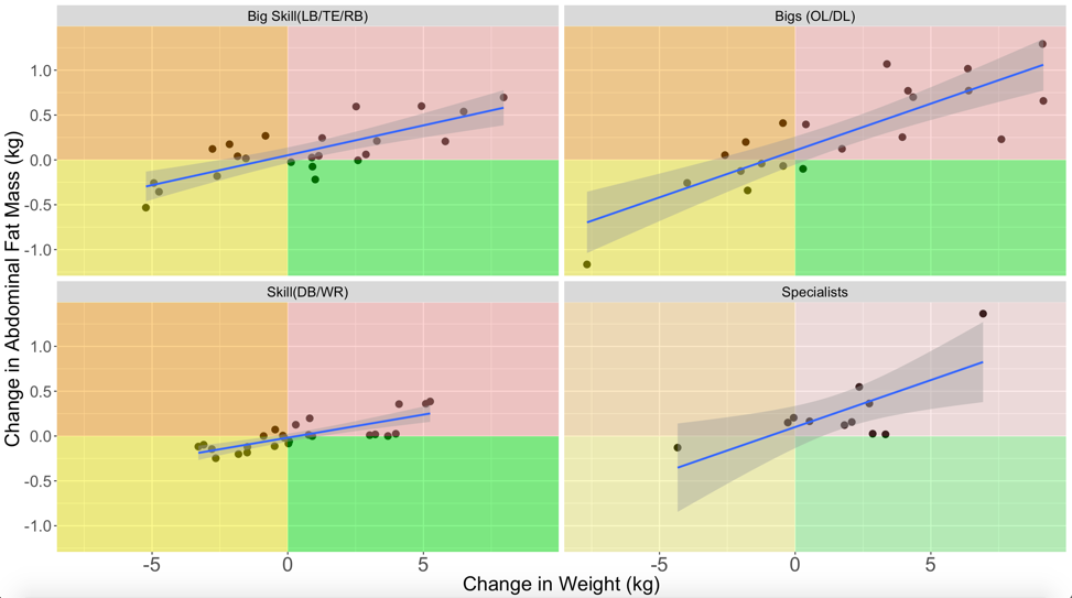 More importantly, though, we see in figure 3 a sharp increase in visceral fat at this same threshold. Visceral fat is the fat that surrounds our organs and is associated with metabolic complications. Visceral fat storage suggests that the body has met the storage capacity limits of subcutaneous storage sites. These changes are observed during a playing season as well. Figure 4 shows the relationship between change in weight and change in abdominal fat storage in football players measured before and after a competitive season. Understanding these relationships can improve both athlete health and performance as increases in abdominal fat have been associated with increased injury risk and decreased performance.