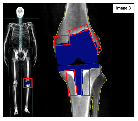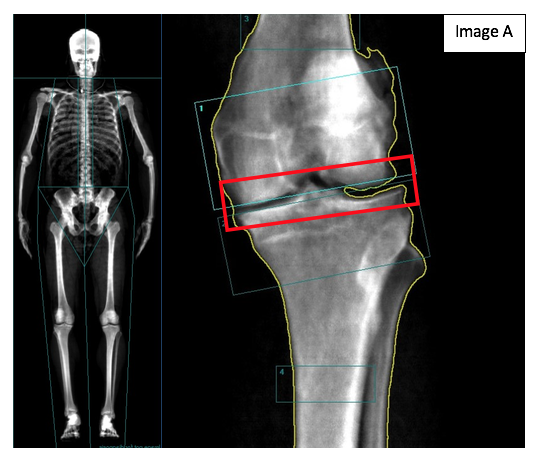 In the image below (Image A), you see the pre-surgical DXA total skeletal scan as well as the isolated left knee DXA scan. In the pre-surgical isolated knee view, you can see the accumulated damage that has occurred in the joint area over the years (highlighted by the red box). It should be noted that a DXA scan would not be used to diagnose whether a replacement is necessary or not. In most cases, an X-ray and/or magnetic resonance image (MRI) would be used by an orthopedic surgeon to diagnose the need for a knee replacement as well as the type of knee replacement required.