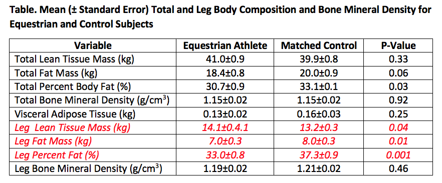 The results for this study can be found in the table below. We found that even though the athletes were matched on body mass index, equestrian athletes had a lower total fat percentage (%fat) than controls. In addition, there was a trend for the equestrian athletes to have lower total fat mass than controls. However, there were no significant differences in total lean tissue mass, total bone mineral density and abdominal visceral adiposity tissue between equestrian athletes and controls. What was interesting was that equestrian athletes, when compared to the controls, had significantly lower leg %fat, leg fat mass and higher leg lean tissue mass (highlighted in red in the table). There was no difference in leg bone mineral density between equestrian athletes and controls.
