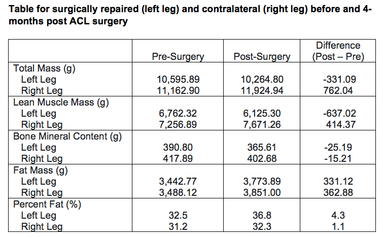 This study has piqued my interest in the changes that occur with ACL surgery and the effect of the rehabilitation process on the composition of both legs. Recently, we scanned an athlete about 6 months before they tore their ACL and had to undergo ACL repair surgery. We just scanned this same athlete about 4 months after ACL surgery. At the time of the second dual X-ray absorptiometry (DXA) scan, the athlete was still undergoing rehabilitation and had not returned to any type of sports training. In the table below, I have presented the DXA data pre- and 4-months post ACL surgery.