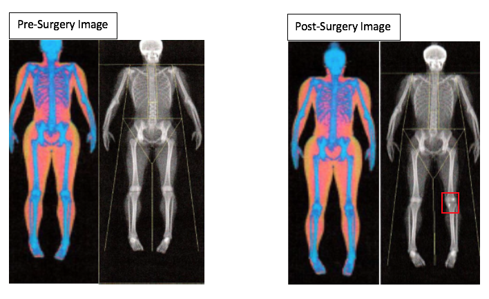 Below you see the pre-surgical and 4-month post-surgical DXA scans of our individual. If you look at the 4-month post-surgical DXA scan, you can see the metal screws on the left leg (red box) that were inserted to hold the graft in place.